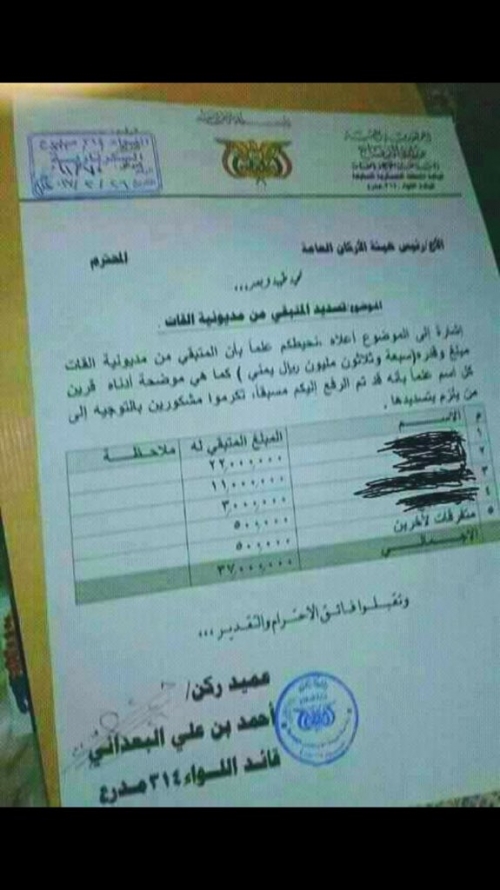 وجاء بالوثيقة الموجهة من قائد اللواء عميد ركن أحمد بن علي البعداني الى رئيس هية الأركان العامة بالجيش الوطني اللواء محمد علي المقدشي طلب تسديد المبلغ المتبقي من مديونية "القات" على قادة كتائب اللواء.