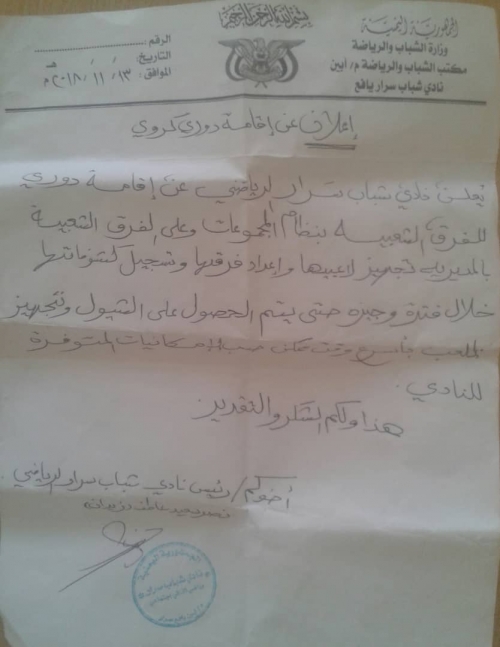 وأهاب نادي سرار الرياضي بالفرق الشعبية بالمديرية بتجهيز لاعبيها وتسجيل كشوفاتها خلال فترة العمل في توسعة وتجهيز الملعب التابع للنادي،الذي سيُدشن فيه العمل مطلع الأسبوع القادم.