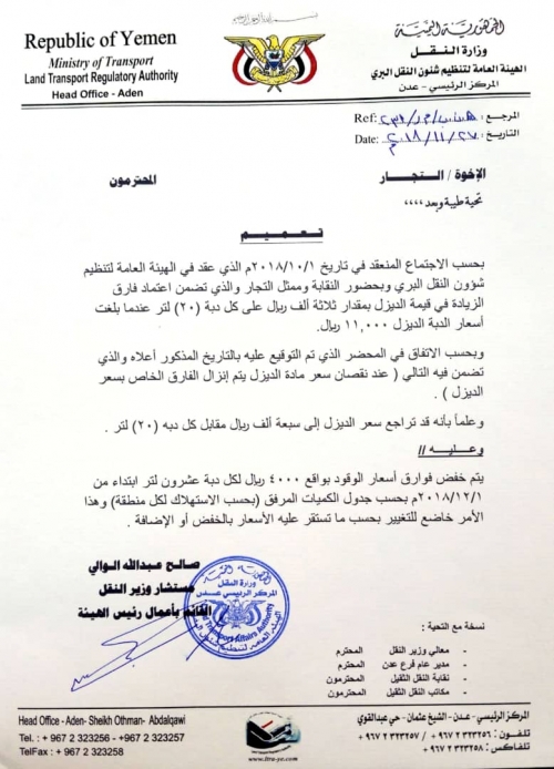 أصدرت الهيئة العامة لتنظيم شؤون النقل البري الثلاثاء تعميما هاما للتجار بحسب الاجتماع الذي عقد سابقا بتاريخ 1/10/2018 مع ممثل عن التجار ونقابة النقل الثقيل والذي قد تضمن إعتماد فارق زيادة في قيمة الديزل بمقدار 3000 الف ريال على كل دبة (20) لتر عندما بلغت أسعار الدبة الديزل حينها 11 الف ريال.