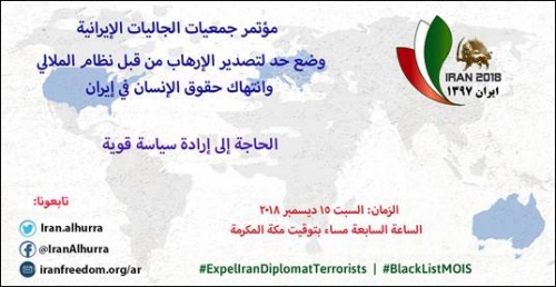 ستعقد جمعيات الجاليات الإيرانية في أوروبا وشمال الولايات المتحدة وأستراليا في 15 ديسمبر 2018 ، مؤتمرًا مشتركًا في 50 مدينة بهدف الدعوة إلى مواجهة انتهاكات حقوق الإنسان وتصدير الإرهاب من قبل نظام الملالي وضرورة اعتماد سياسة حاسمة تجاهه. وسيتم تواصل وقائع هذه المؤتمرات من خلال شبكات الإنترنت.