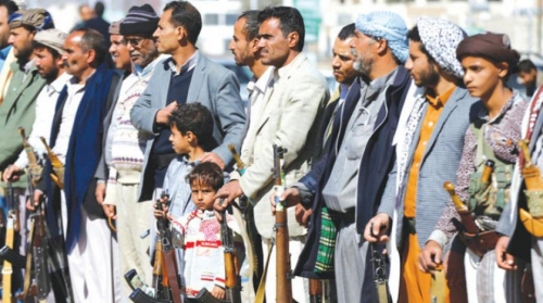 تجمع حوثي في صنعاء أمس للاستعراض ويبدو الأطفال والصبيان يمسكون بالأسلحة