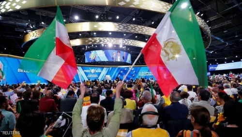 معارضون ايرانيون يرفعون علم بلادهم خلال احد المؤتمرات