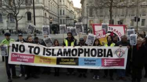 ريطانيون نظموا وقفة أمام مقر الحكومة ورفعوا لافتات تطالب برفض تخويف الناس من الإسلام