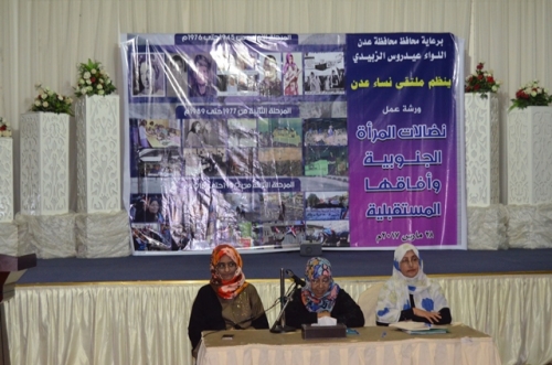 نظم ملتقى نساء عدن ورشة نقاشية عن نضالات المرأة الجنوبية وافاقها المستقبلية برعاية اللواء عيدروس الزبيدي محافظ العاصمة تحت شعار " نضالات المرأة الجنوبية وأفاقها المستقبلية".