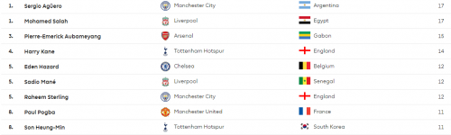 وفى ترتيب الهدافين، عادل النجم الأرجنتيني سيرجيو أجويرو، مهاجم مانشستر سيتي، نجمنا المصري محمد صلاح، برصيد 17 هدفا في الصدارة حيث سجل الفرعون هدفا واحدا، بينما سجل الأرجنتيني ثلاثية.