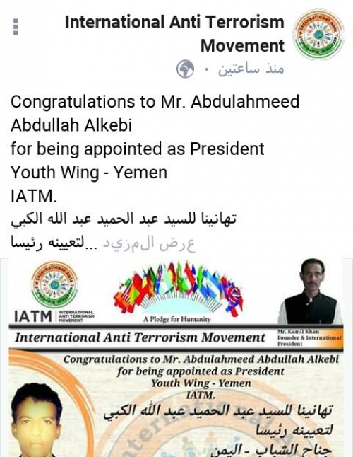 أعلنت الحركة الدولية لمكافحة الإرهابIATM في موقعها الرسمي تعين السفير/عبد الحميد الكبي رئيساً لجناح الشباب للحركة الدولية لمكافحة الإرهاب IATM في اليمن.