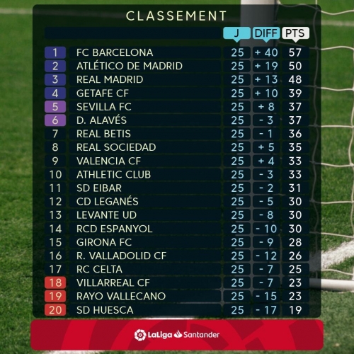 وفيما يلي ترتيب الدوري الاسباني بعد نهاية الجولة الـ25 ..