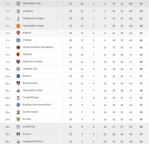 وجاء توتنهام فى المركز الثالث برصيد 61 نقطة، على الرغم من خسارته أمام ساوثهامبتون 2-1 اليوم، فيما يأتى مانشستر يونايتد رابعا برصيد 58 نقطة، قبل موقعة ارسنال (الخامس 57 نقطة) اليوم الأحد على ملعب "الإمارات".