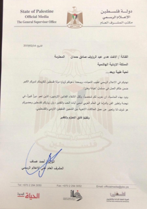 كرم رئيس دولة فلسطين محمود عباس، الفنانة الاردنية هدى حمدان وأسرة مسلسل "خيانة وطن "، تقديراً لأعمالهم الفنية الهادفة التي اسهمت في رفع مستوى الوعي الثقافي والوطني لدى ابناء أمتنا العربية حيث استقبل سيادته، في مقر الرئاسة بمدينة رام الله، اسرة مسلسل "خيانة وطن".