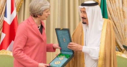وخلال الاجتماع الذى عقد فى قصر اليمامة الملكى فى الرياض منح الملك سلمان رئيسة الوزراء البريطانية وشاح الملك عبد العزيز.