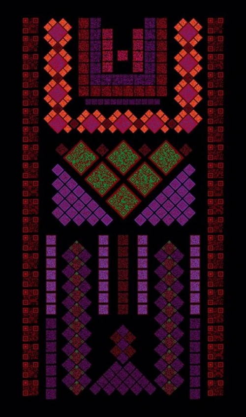 تقدّم الفنانة سلافة حجازي ثوباً رقمياً على الطريقة التراثيّة لمنطقة بلاد الشام، إلا أن العنصر الزخرفي المتكرّر هو رمز الاستجابة السريعة QR codes. تقول سلافة إنه "يمكن تصفّح كل رمز من رموز العمل من خلال الهاتف الذكي، ليقود كل منها إلى رابط مُعيّن، كمقال أو صورة أو فيديو أو مسوّدات فنية أو عناصر شخصيّة".