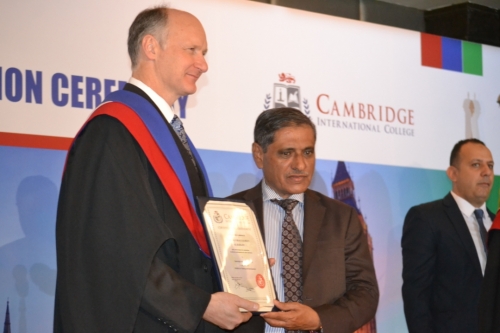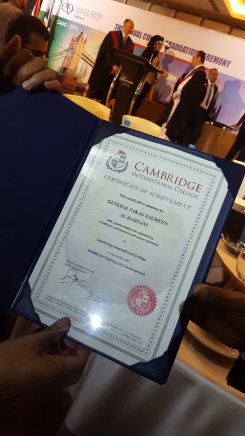 جرى ذلك بحضور محافظ حضرموت الذي تلقى دعوة رسمية من كلية كامبريدج الدولية لحضور الاحتفال الذي تقيمة الجامعة كل سنتين لتكريم ابرز الشخصيات العربية والافريقية التي تميزت بمستوى عالٍ من الإنجاز .