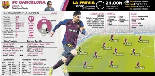 وكشفت صحيفة "موندو ديبورتيفو"الكتالونية عن التشكيل المتوقع لقمة برشلونة ضد مان يونايتد فى إياب دور الـ8 بتشامبيونزليج مساء اليوم.