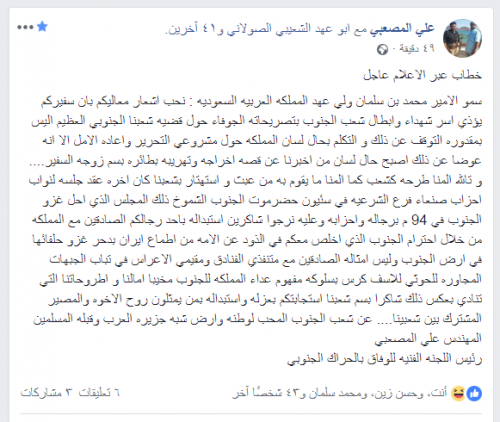 وقال المهندس علي المصعبي في رسالته التي نشرها بصفحته بالفيس بوك : نحب اشعار معاليكم بان سفيركم يؤذي اسر شهداء وابطال شعب الجنوب بتصريحاته الجوفاء حول قضيه شعبنا الجنوبي العظيم.