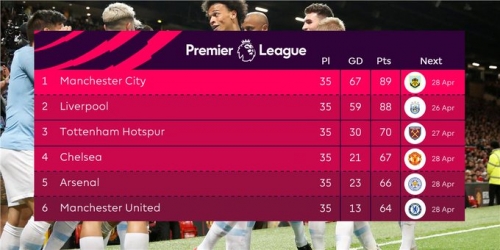 ورفع مانشستر سيتي رصيده للنقطة 89 فى صدارة جدول ترتيب الدوري الإنجليزي، متفوقا بفارق نقطة واحدة عن ليفربول صاحب المركز الثانى برصيد 88 نقطة، بينما توقف رصيد مانشستر يونايتد عند 64 فى المركز السادس.