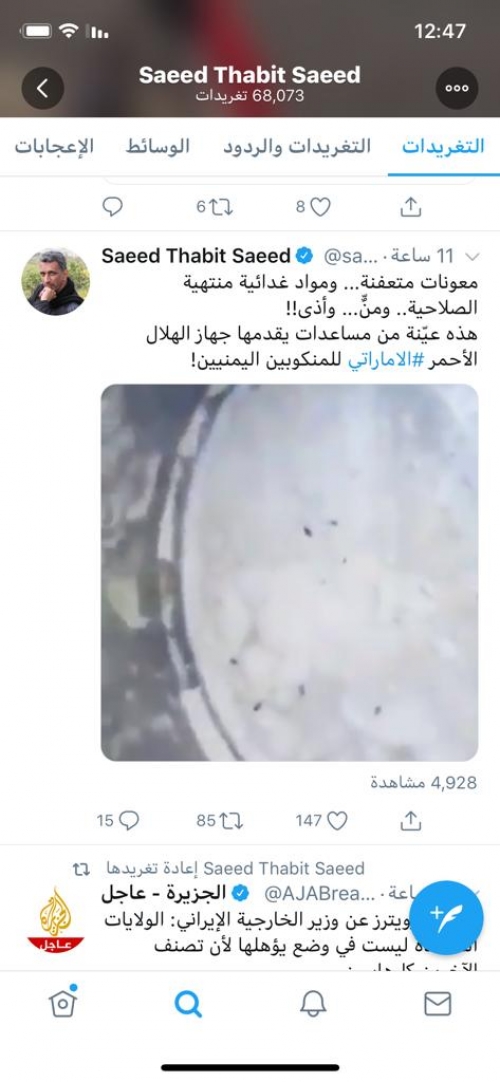 وبدأ مدير مكتب الجزيرة القطرية في اليمن سعيد ثابت بالترويج لدقيق تالف قدم عن طريق برنامج الأغذية العالمي والمجلس الدنماركي، زعم ثابت انه مقدم من الهلال الأحمر الإماراتي.