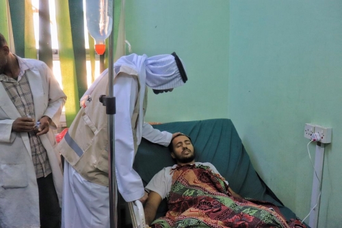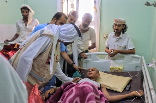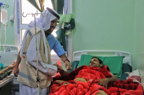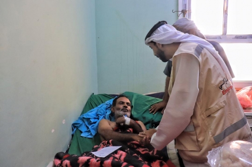 ممثل هيئة الهلال الأحمر الإماراتي خلال تفقده الجرحى والمرضى بالمستشفى - المصدر