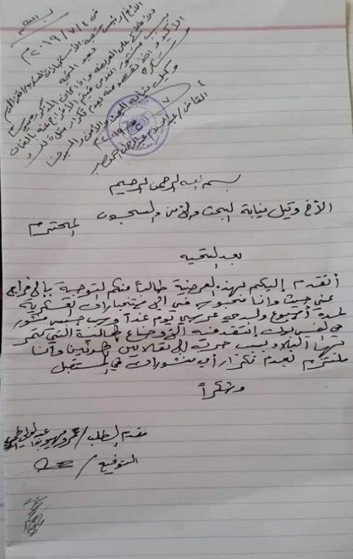 في مناشدته كتب الناشط المعتقل الحميري رسالة الى النيابة العامة وتعهد بعدم كتابة اي منشور مرة اخرى .