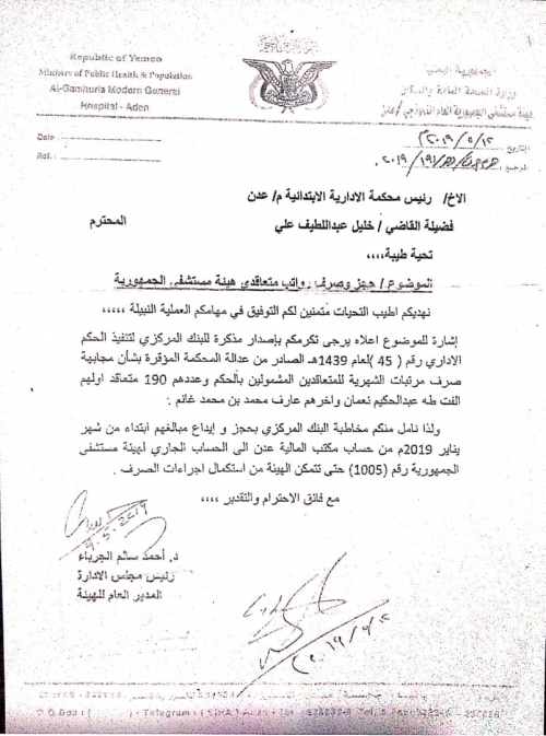 صُدم متعاقدو مستشفى الجمهورية بعدن بخبر إيقاف صرف رواتبهم من رئيس المحكمة الإدارية بالعاصمة عدن.