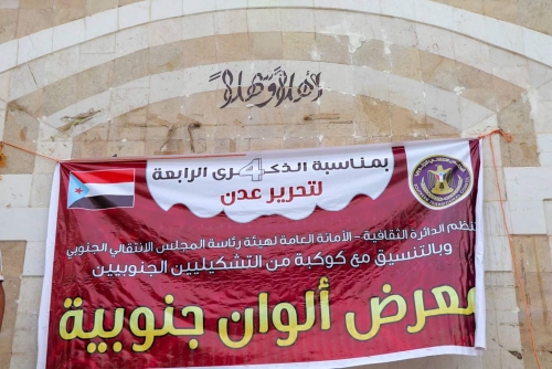 نظمت الدائرة الثقافية في الأمانة العامة لهيئة رئاسة المجلس الانتقالي الجنوبي الخميس الموافق 25 يوليو 3019، وبالتنسيق مع كوكبة من الفنانيين التشكيليين الجنوبيين، معرض لوحات فنية تراثية تحت اسم "ألوان جنوبية"، بمناسبة الذكرى الرابعة لتحرير عاصمة الجنوب عدن في حديقة البراعم بمديرية المعلا .. وقد شارك في هذه الفعالية عدد من الفنانين التشكيليين وهم .. ابتهال القباطي .. ألطاف فارع وكليب محمد كليب وأحمد علوي .. محمد عبد الوهاب .. ناصر الحربي .. إيناس ناصر .. سمر محمد باعبيد .. اجلال القباطي .. آمال رمزي .. صابرين مبارك .. اكرام عبد الواسع .. أحمد وليد .. آمنة محمد سالم .. اعتدال علي أحمد .. أزهار مصطفى .. حلمي فهمي .. صفاء أنيس .. مراد علاء ماضي .. علاء بازبيد .. أسيلة محمد بامطرف .. روان عقاد حسن .. ناصر السقاف .. أميمة حسن محمد .. حيث تناولت اللوحات معالم مدينة عدن وعكست هوية الجنوب الثقافية .. كذلك شارك الفنان ناصر الحربي بمجسمات لأشهر معالم المدينة .. وفي المعرض القى الأستاذ عمرو محمد عقيل، رئيس الدائرة الثقافية في الأمانة العامة لهيئة رئاسة المجلس الانتقالي الجنوبي، كلمة رحب فيها بالحضور، ناقلاً لهم تحيّات الرئيس القائد عيدروس قاسم الزُبيدي، رئيس المجلس الانتقالي الجنوبي، وكذا تحيّات الأمين العام، الأستاذ أحمد حامد لملس.