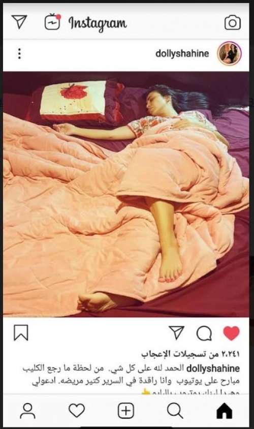 وكتبت السوبر ستار دوللي شاهين عبر حسابها علي Instagram الحمد لله على كل شئ من لحظة ما رجع فيديو كليب الحاجة داعيالك امبارح على يوتيوب وأنا راقدة في السرير كتير مريضه ادعولي