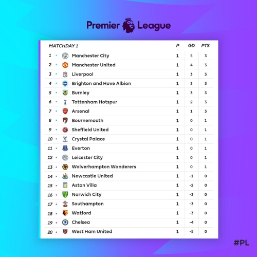 وجاءت ترتيب الدوري الإنجليزي بعد نهاية الجولة الأولى كالتالي..