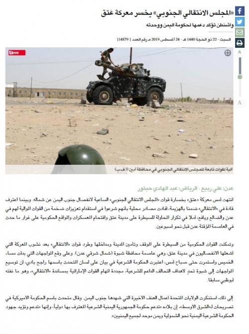 وقالت الصحيفة "تمكنت القوات الحكومية من السيطرة على الموقف وتأمين المدينة ومداخلها وطرد قوات «الانتقالي» بعد نشوب المعركة التي أشعلها الانفصاليون في مدينة عتق، وهي عاصمة محافظة شبوة (شمال شرقي عدن)".