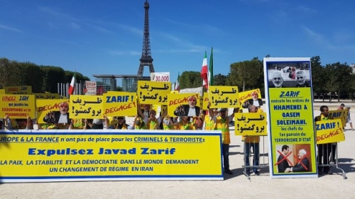 في تظاهرة احتجاجية طالب أبناء الجالية الإيرانية في فرنسا وأنصار المقاومة الإيرانية ومنظمات حقوق الإنسان بطرد جواد ظريف، وزير خارجية نظام الملالي من باريس.