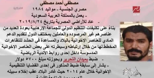 مصطفى أحمد مصطفى مصري الجنسية، يعمل بالمملكة العربية السعودية، وعاد للأراضي المصرية بتاريخ 24 أغسطس (آب) 2019، بناء على تكليفات التنظيم الدولي للإخوان بعودة العديد من عناصرهم غير المرصودة والعاملين بمختلف الدول لتقديم الدعم المادى للعناصر الإخوانية بالبلاد والمساعدة في الحشد للتظاهرات المخطط لها من خلال ارتباطه وسيطرته على بعض العناصر الإخوانية المدسوسة داخل إحدى روابط الأندية الرياضية، وضبط بميدان التحرير، وقد اعترف بتقاضى 5 آلاف دولار من القيادات الإخوانية الهاربة لتوزيعها على الشباب ودعم المظاهرات ضد مصر.