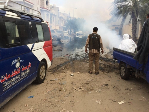 حيث تقوم فرق الرش الضبابي التابعة لفرصة للخدمات بالرش في أوقات الصباح الباكر باستهداف جميع بؤر البعوض بالمياه الراكدة ومياه الصرف الصحية وكذا أماكن تواجد القمامة وبالإضافة إلى جميع أحياء وشوارع المديريتين المستهدفة.