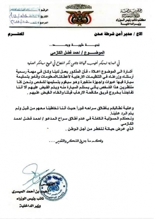 وجاء كشف الوثائق بعد ثلاثة أيام من تصريحات للوزير اليمني، اعترف من خلالها انه يقوم بتهريب الأسلحة إلى عدن، قبل ان يخرج قائد قوات مكافحة الإرهاب للتأكيد على انه يمتلك ادلة ووثائق تثبت تورط الميسري في عمليات إرهابية والتخطيط لقتل أجانب في عدن.