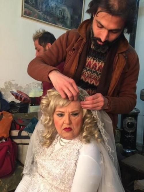 وظهرت نجيب بفستان الزفاف الأبيض، مع مزين للشعر وهو يضع اللمسات الأخيرة على تسريحتها.
