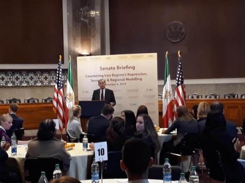 اقیمت ندوة صحفية مساء یوم الاربعاء 06 تشرین الثانی/ نوفمبر ۲۰۱۹ فی مجلس الشیوخ الإمریکي برعایة منظمة الجاليات الأمريكية الإيرانية انصار المقاومة الإیرانیة ومجاهدي خلق تحمل "مواجهة قمع النظام الإيراني والإرهاب والتدخل الإقليمي" .