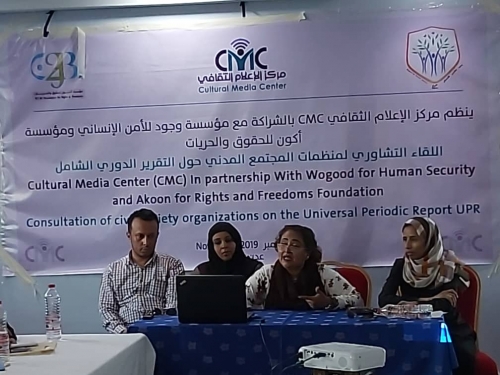 عقد اللقاء التشاوري لمنظمات المجتمع المدني حول التقرير الدوري الشامل UPR والذي نظمه مركز الاعلام الثقافي(CMC) بالشراكة مع مؤسسة وجود للأمن الانساني ومؤسسة اكون للحقوق والحريات.
