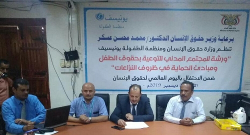 أقيمت صباح اليوم الثلاثاء في مقر وزارة حقوق الإنسان بالعاصمة عدن وبرعاية وزير حقوق الإنسان الدكتور/ محمد محسن عسكر" ورشة للمجتمع المدني للتوعية بحقوق الطفل ومبادئ الحماية في ظروف النزاعات " والتي استمرت ليوم واحد وبمشاركة عدد من منظمات المجتمع المدني والقضاة والمحاميين.