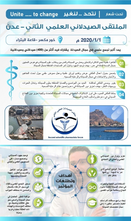 تستمر اللجنة التحضيرية لملتقى الصيادلة العلمي الثاني في عدن جهودها وتحضيراتها لإقامة فعاليات التظاهرة العلمية المقرر تنظيمها في 2019/1/1 بمديرية خور مكسر قاعة البتراء .