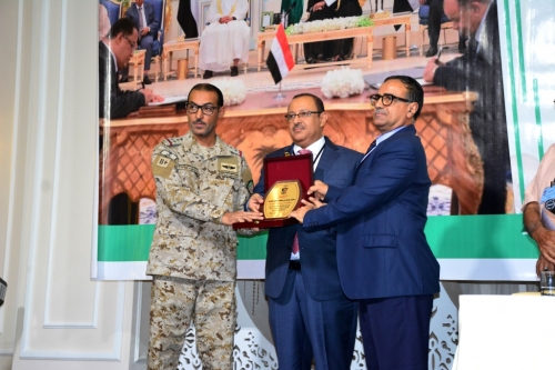 بعد ذلك كرم الدكتور/ الخضر ناصر لصور رئيس الجامعة ومعه العميد طيار/ مجاهد العتيبي قائد التحالف العربي, مركز الملك سلمان للإغاثة والأعمال الإنسانية، بدرع جامعة عدن، تسلمه الأستاذ/صالح ذيبان المشرف على المركز, وترس الشكر والعرفان الأخر للبرنامج السعودي للإعمار,تسلمه الأخ/عبدالسلام السلفي .