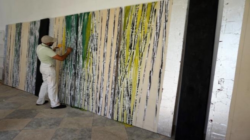 المعرض يتضمن مجموعة من اللوحات من التجربة الجديدة للفنان، والتي يصمم فيها أشكالاً طولية عمودية، بعضها مستوحى من غابات البامبو اليابانية، وبعضها أكثر تجريداً، وتبدو كما لو أنها ألواح أخشاب متراكمة ومتراكبة.