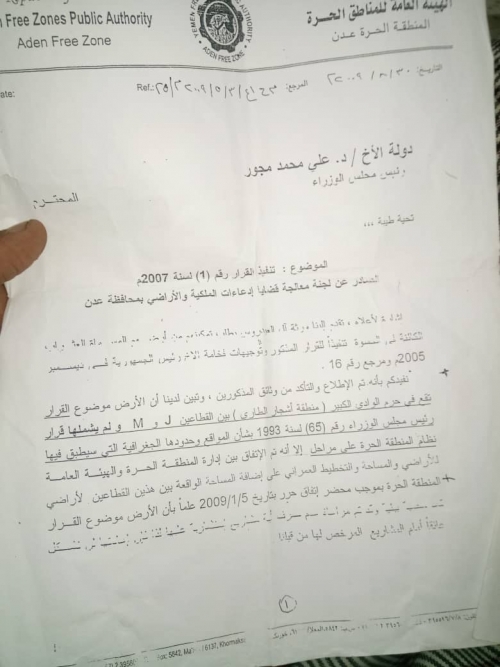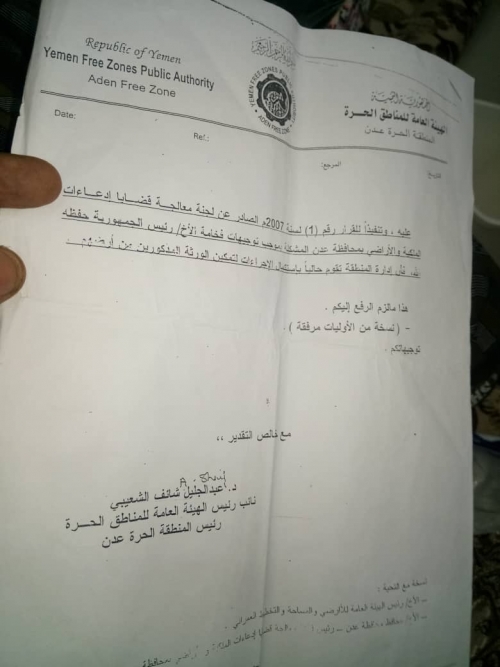 وقال الحريبي "نوضح لشعب الجنوب ولكل ذوي حق ان لدينا من الاوامر الادارية الصادرة من الهيئة العامة للمنطقة الحرة ما يثبت ان هذه الارض ارض العيدروس وهذا الاعتراف من المنطقة الحرة وكان هذا عام 2009م وهو عبارة عن اخلاء طرف من الهيئة توضح احقية ورثة العيدروس للأرض والمسماة ارض العثراب وبحدودها . وانماء العقد الذي يعي به الهمامي عقد مصروف من نفس الجهة عام 2015م ، وهذا دليل اخر وقاطع على احقية ورثة العيدروس بارضهم وناهيك عن الاحكام الصادرة لشركة الارض لورثة العيدروس".