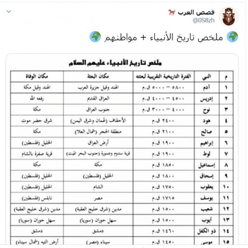 نشرت صفحة "قصص الأنبياء" على موقع التواصل الاجتماعى "تويتر" جدولاً قالت فيه "إنه يحتوى "تاريخ الأنبياء وموطنهم" وكتب أسفل الجدول أن هذه المعلومات مستمدة من كتب (المعارف لابن قتيبة، البداية والنهاية لابن كثير، أطلس تاريخ الأنبياء والرسل لسامى المغلوث.