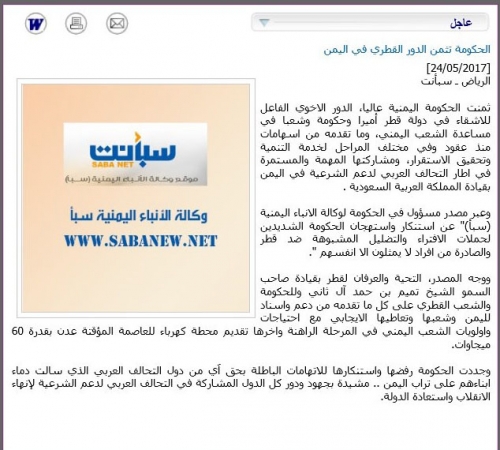 في موقف مفاجئ آثار الإستغراب في وسائل الاعلام اليمنية، انضم موقع وكالة الأنباء اليمنية سبأ التابع للحكومة الشرعية إلى حملة الدفاع عن قطر عقب التصريحات المثيرة للجدل التي أدلى بها الشيخ تميم بن حمد.