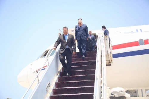 رئيس الحكومة اليمنية ومحافظ عدن لحظة ترجهما من الطائرة في مطار العاصمة الجنوبية