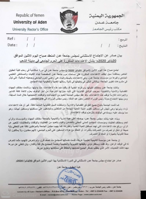 ناشد أعضاء مجلس جامعة عدن في بيان لهم رئاسة الحكومة وكافة الجهات المسوؤلة وقيادة التحالف العربي في عدن، والرأي العام والمجتمع المدني، سرعة التدخل لرفض ومنع الاعتداءات على أراضي الحرم الجامعي والجمعية السكنية التابعة للجامعة.