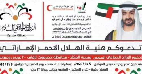 نظمت هيئة الهلال الأحمر الإماراتي صباح اليوم الخميس 5 مارس 2020 العرس الجماعي السادس في محافظة حضرموت بمديرية المكلا.