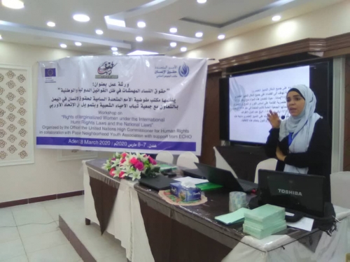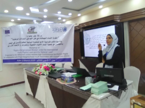 نظم مكتب مفوضية الأمم المتحدة السامية لحقوق الإنسان في اليمن بالتعاون مع جمعية شباب الاحياء الشعبية وبتمويل من الاتحاد الاوروبي صباح يوم السبت7مارس2020م في العاصمة عدن، ورشة عمل بعنوان ”حقوق النساء المهمشات في ظل القوانين الدولية والوطنية “ بمناسبة اليوم العالمي للمرأة، بمشاركة عدد من نشطاء منظمات المجتمع المدني .