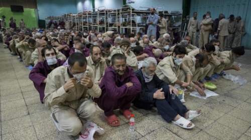 مشردون إيرانيون في مركز إيواء بعد توزيع كمامات عليهم