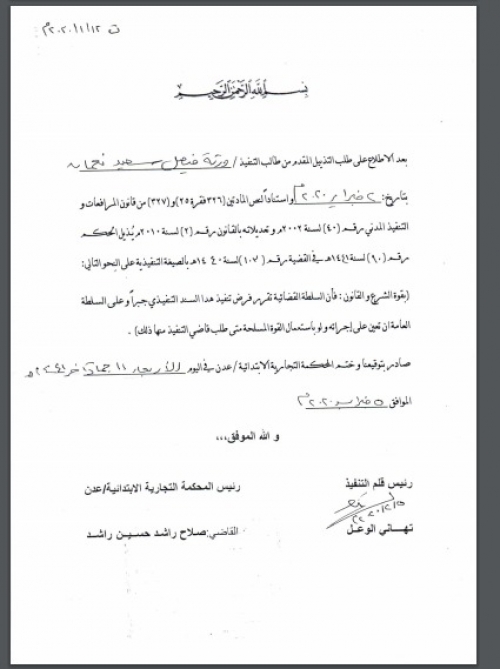 وبينت الوثائق "بعد الاطلاع على طلب التدبيل من طالب التنفيذ/ ورثة فيصل سعيد نعمان، بتاريخ: 2 فبراير 2020م واسنادا لنص المادتين (326 فقرة 25) و (327) من قانون المرافعات والتنفيذ المدني رقم (40) لسنة 2002م وتعديلاته بالقانون رقم (2) لسنة 2010م يذيل الحكم رقم (10) لسنة 1441هـ في القضية رقم (103) لسنة 1440هـ بالصيغة التنفيذية على النحو التالي: