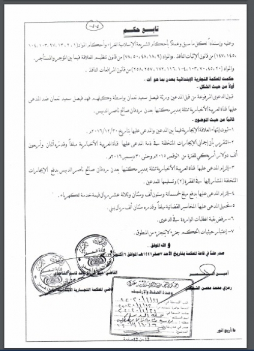 وصدر المختوم بختم المحكمة التجارية الابتدائية / عدن في يوم الاربعاء 5 فبراير 2020م، وجاء في نص الحكم :" قبول الدعوى المرفوعة من قبل المدعين ورثة فيصل سعيد نعمان بواسطة وكيلهم فهد فيصل سعيد نعمان ضد المدعى عليها قناة العربية الاخبارية ممثلة بمدير مكتبها بعدن ردفان صالح ناصر الدبيس.