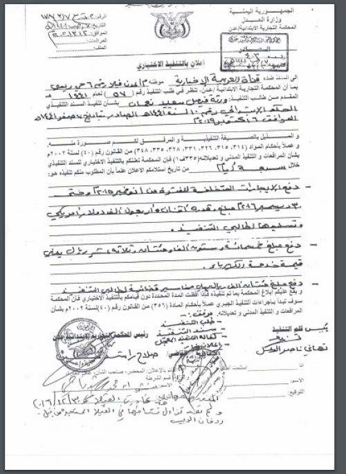 تواجه قناة العربية الإخبارية السعودية حكما صادرا من المحكمة التجارية في عدن، وتتهرب من التنفيذ والمحكمة تقرر تنفيذ الحكم جبرا بالقوة المسلحة.