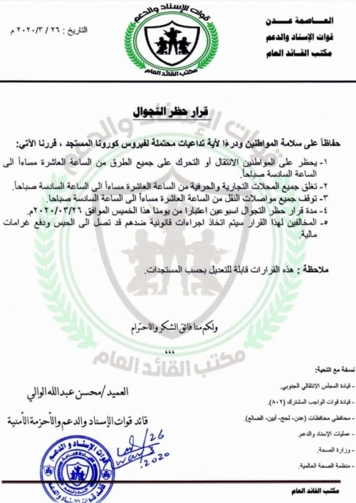 أصدرت قيادة الدعم والإسناد ممثلة بالعميد محسن الوالي قرار حظر تجوال المواطنين في العاصمة عدن للحفاظ على سلامتهم ودرءا لأي تداعيات محتملة لفيروس كورنا المستجد.